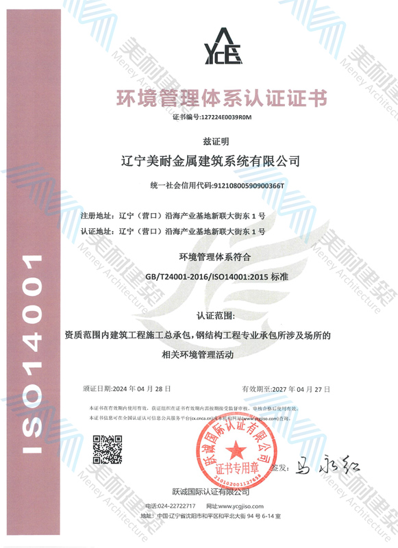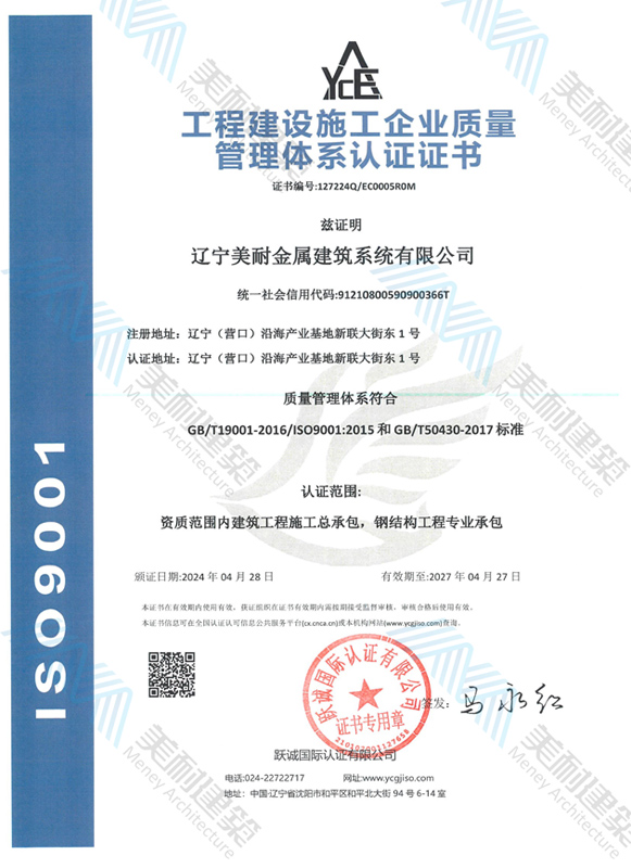 遼寧美耐金屬建筑系統(tǒng)有限公司位于遼寧(營口)沿海產(chǎn)業(yè)基地,專注于預制金屬建筑系統(tǒng)領域,是一家集工業(yè)建筑設計、制作、施工及相關的技術(shù)咨詢與服務為一體的綜合性服務企業(yè)。作為國家鋼結(jié)構(gòu)協(xié)會會員、中國建筑金屬結(jié)構(gòu)協(xié)會會員單位與國家高新技術(shù)企業(yè),美耐建筑集建筑工程施工總承包、鋼結(jié)構(gòu)工程專業(yè)承包等多種資質(zhì)于一身,并擁有22項鋼結(jié)構(gòu)建筑領域?qū)@?項軟件著作權(quán)。